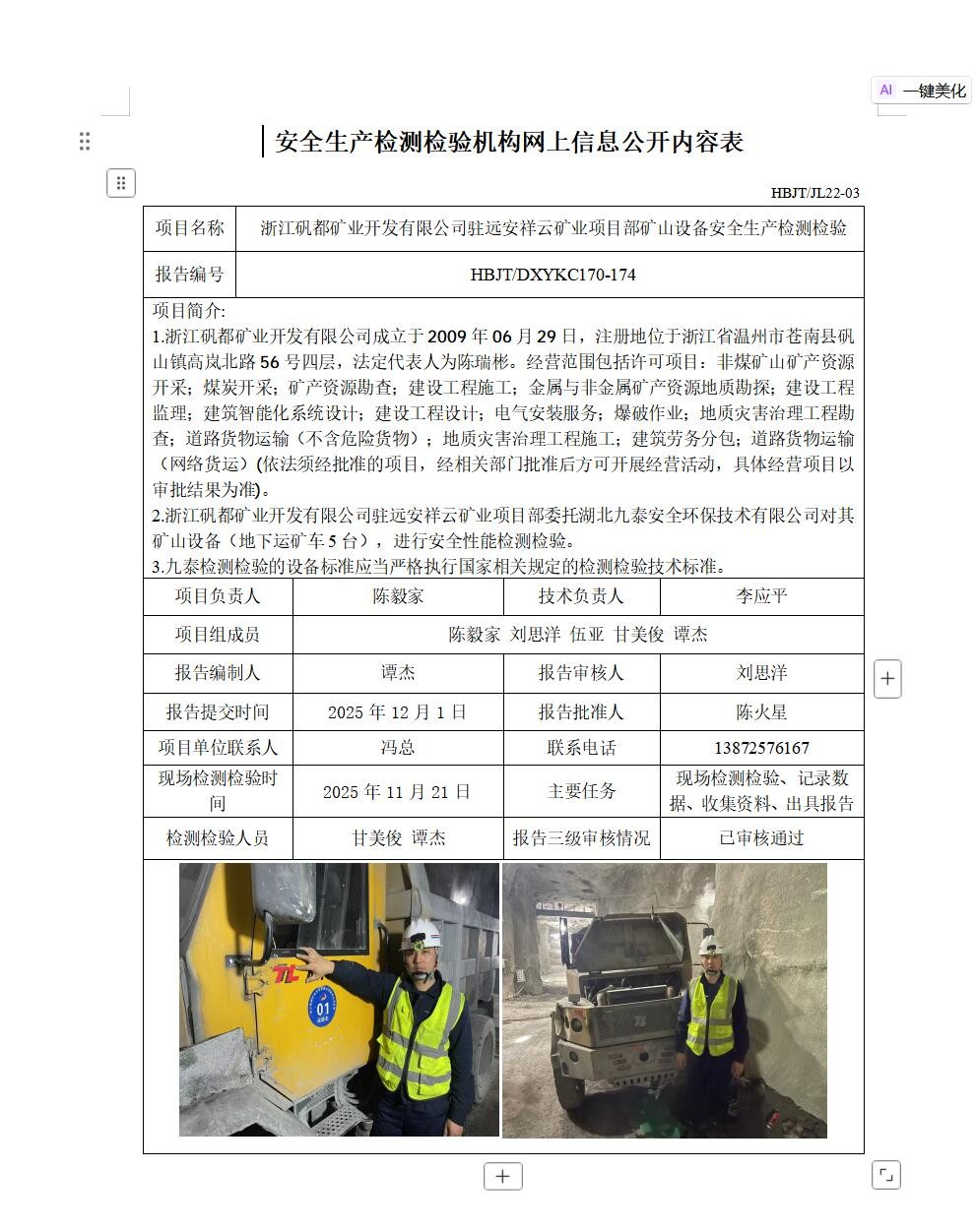 上一篇:?浙江寶樹建設集團有限公司礦山設備安全生產(chǎn)檢測檢驗