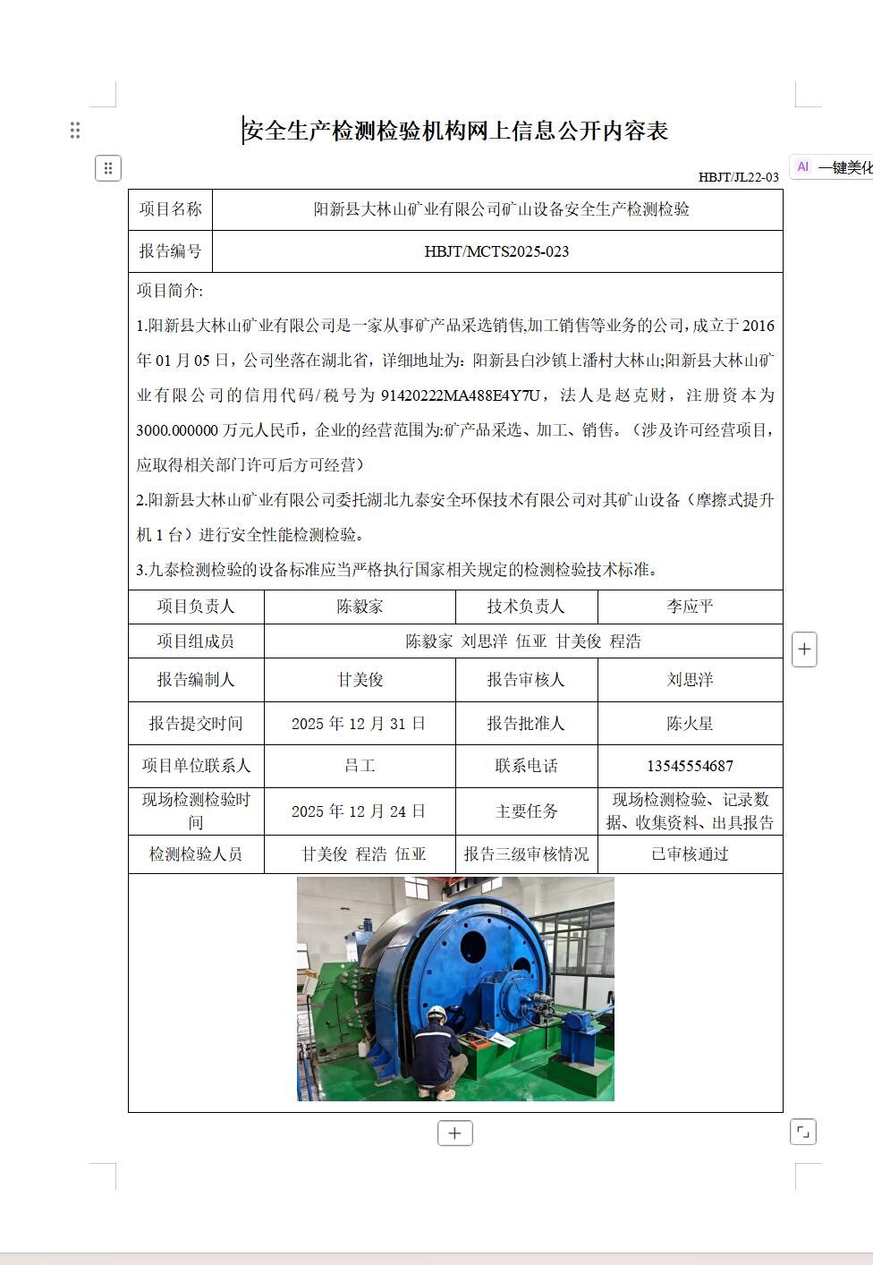 下一篇:?大冶市方盛礦業(yè)有限責任公司礦山設(shè)備安全生產(chǎn)檢測檢驗